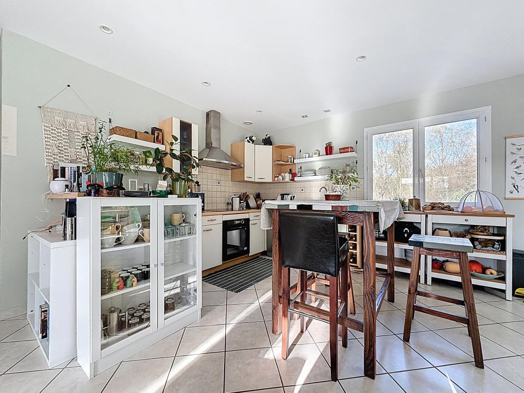 La maison, en excellent état intérieur, dispose d'une cuisine équipée et indépendante, idéale pour les amateurs de cuisine. Les ouvertures en bois et les portes à double vitrage garantissent une isolation optimale et une esthétique raffinée.