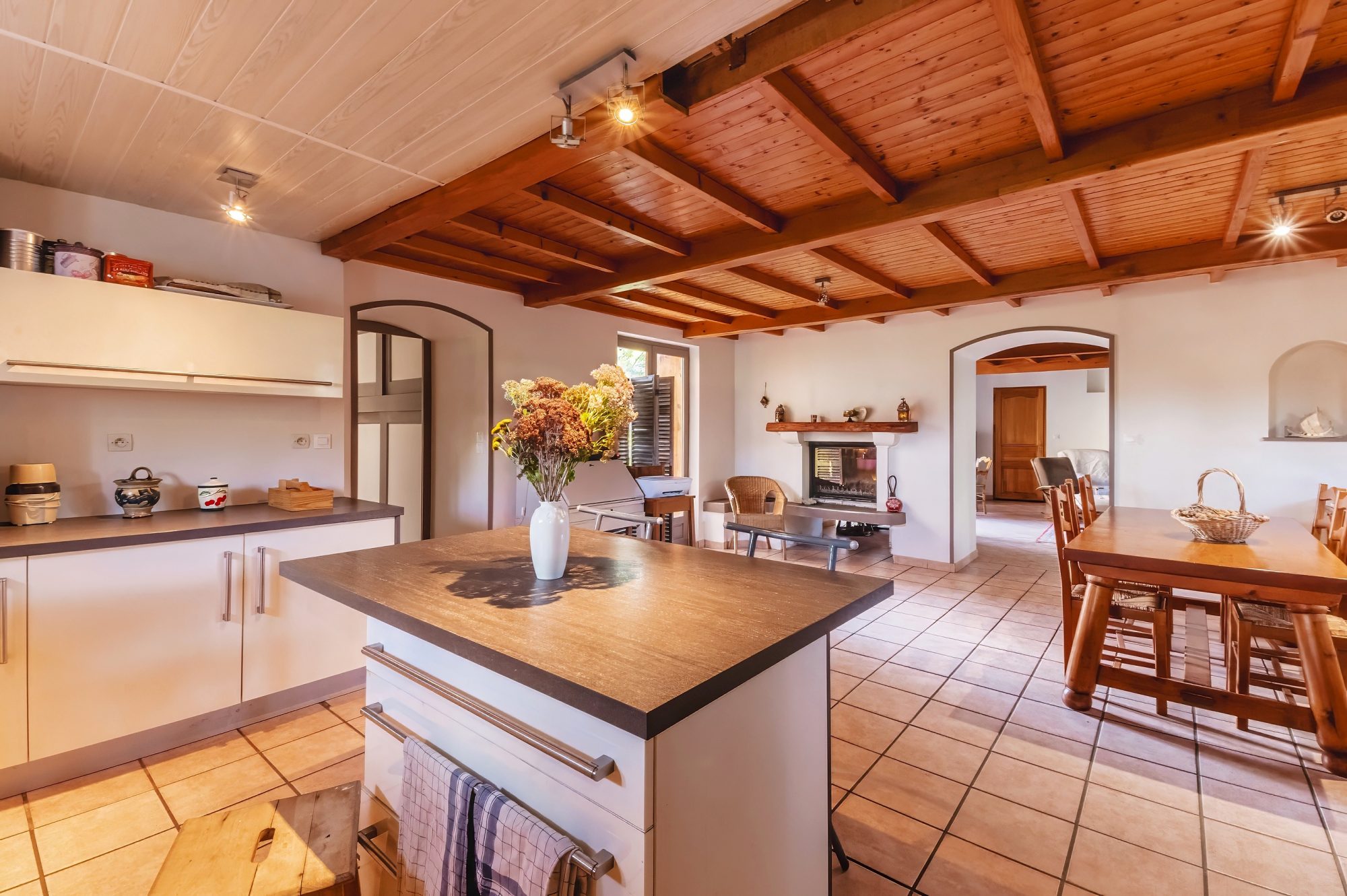 La maison, en excellent état intérieur, dispose d'une cuisine équipée et indépendante, idéale pour les amateurs de cuisine. Les ouvertures en bois et les portes à double vitrage garantissent une isolation optimale et une esthétique raffinée.
