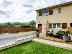 Terrasse en bois à l'avant avec petit cabanon de jardin Terrasse carrelée couverte à l'arrière Agréable coin cuisine d'été pour profiter des beaux jours Terrain clos d'environ 130m2