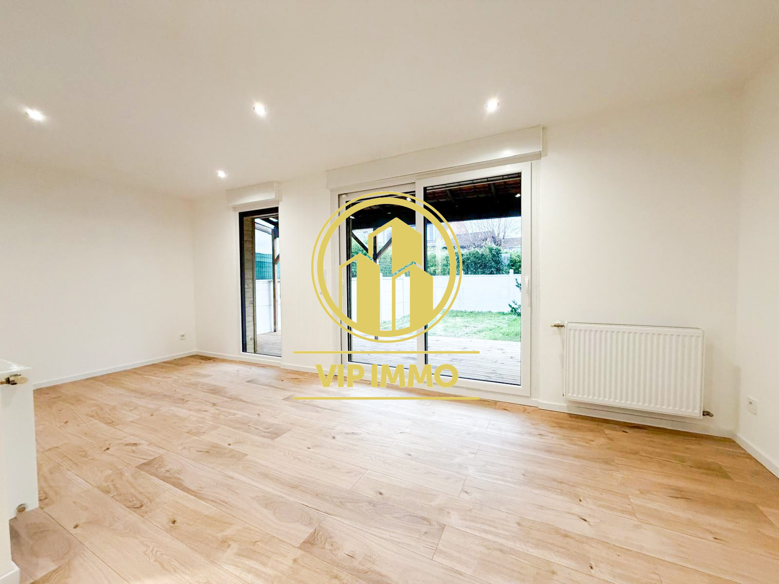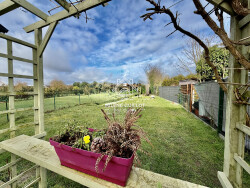 La maison comprend un grand garage avec une porte motorisée et donnant accès au jardin par une porte de service. Le jardin est clôturé et arboré.