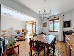 Cuisine, salon, salle à manger et véranda donnant sur l'extérieur 4 chambres 2 WC indépendants (dont un au rez-de-chaussée) Garage + carport Climatisation réversible Puits Arbres fruitiers et agrumes Casot de jardin Terrain piscinable