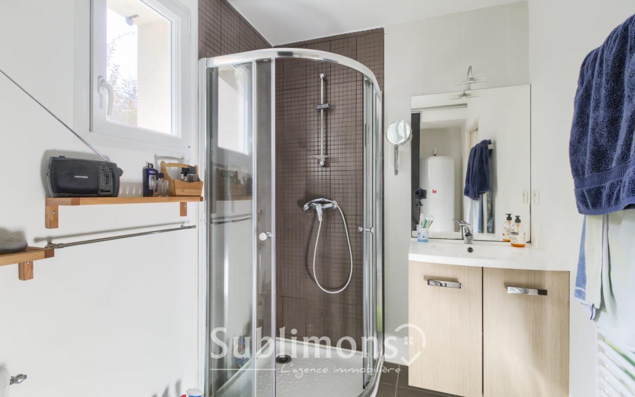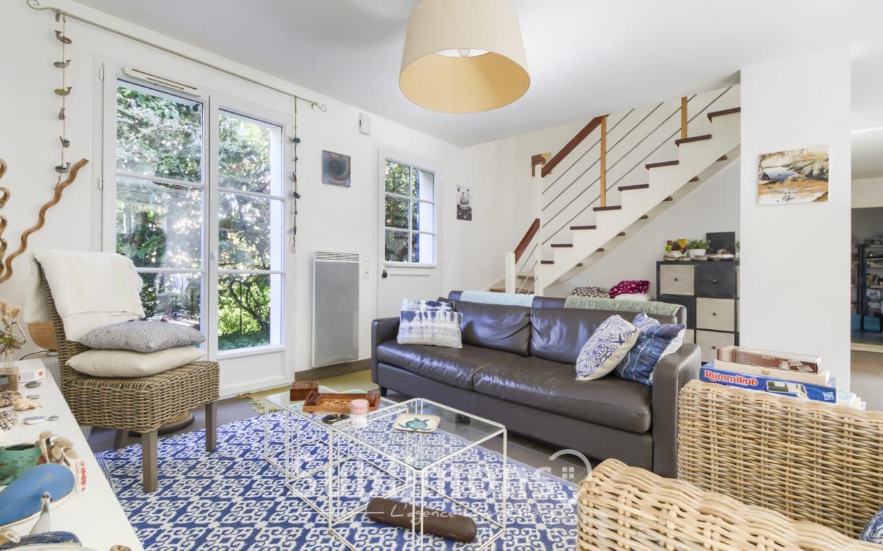Elle se compose d'une vaste pièce de vie (30 m2) et de sa cuisine équipée donnant sur le jardin de 361 m2, à l'étage un espace nuit de 2 chambres avec salle de bain et wc .