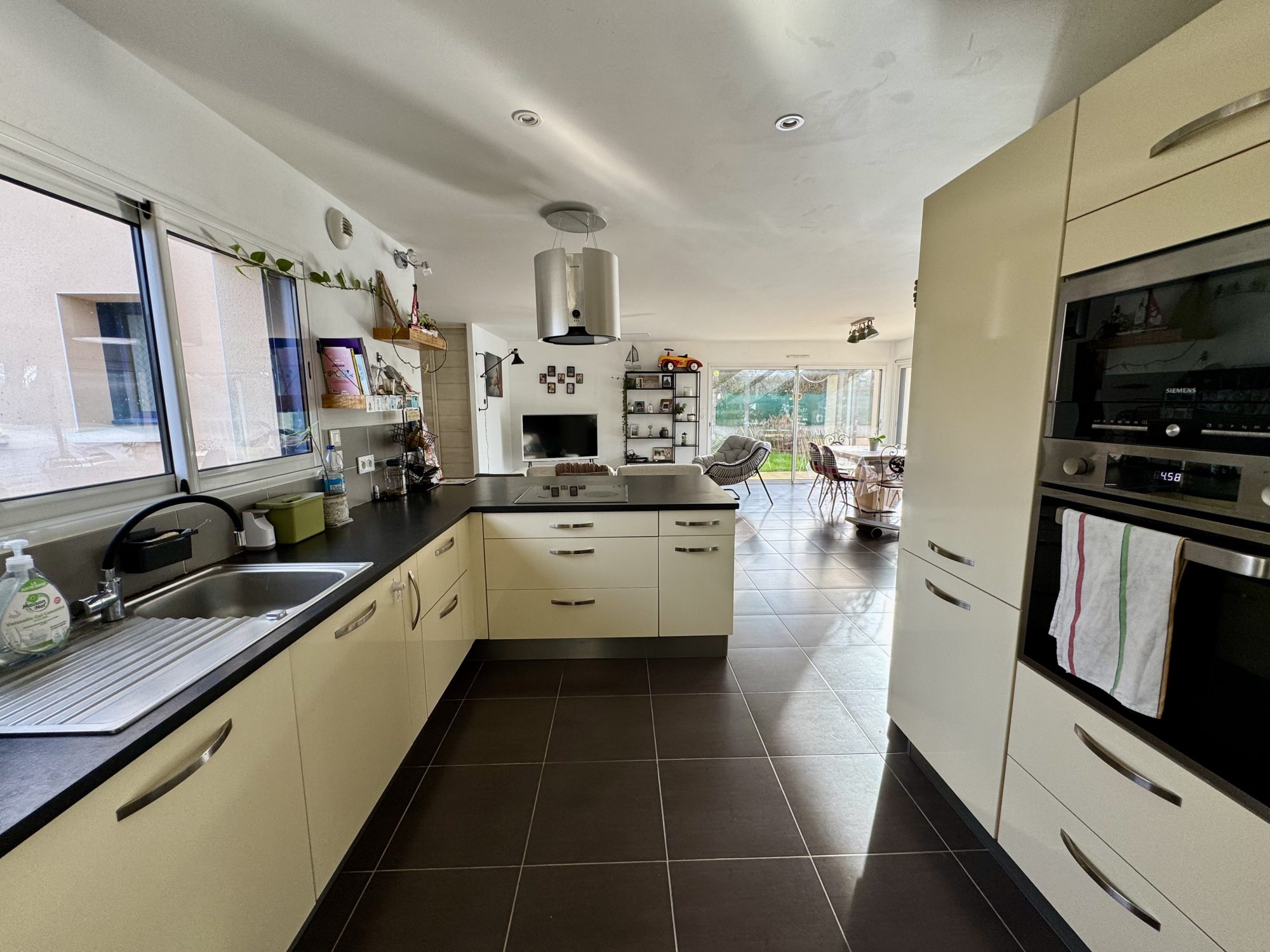 Elle se compose d'une vaste pièce de vie (30 m2) et de sa cuisine équipée donnant sur le jardin de 361 m2, à l'étage un espace nuit de 2 chambres avec salle de bain et wc .