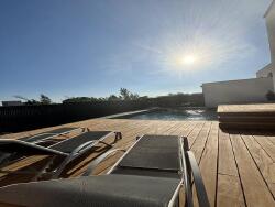 Une pièce de vie lumineuse réunissant salon, séjour et cuisine ouverte, le tout ouvrant sur une terrasse en bois exotique avec vue sur la piscine 4x6