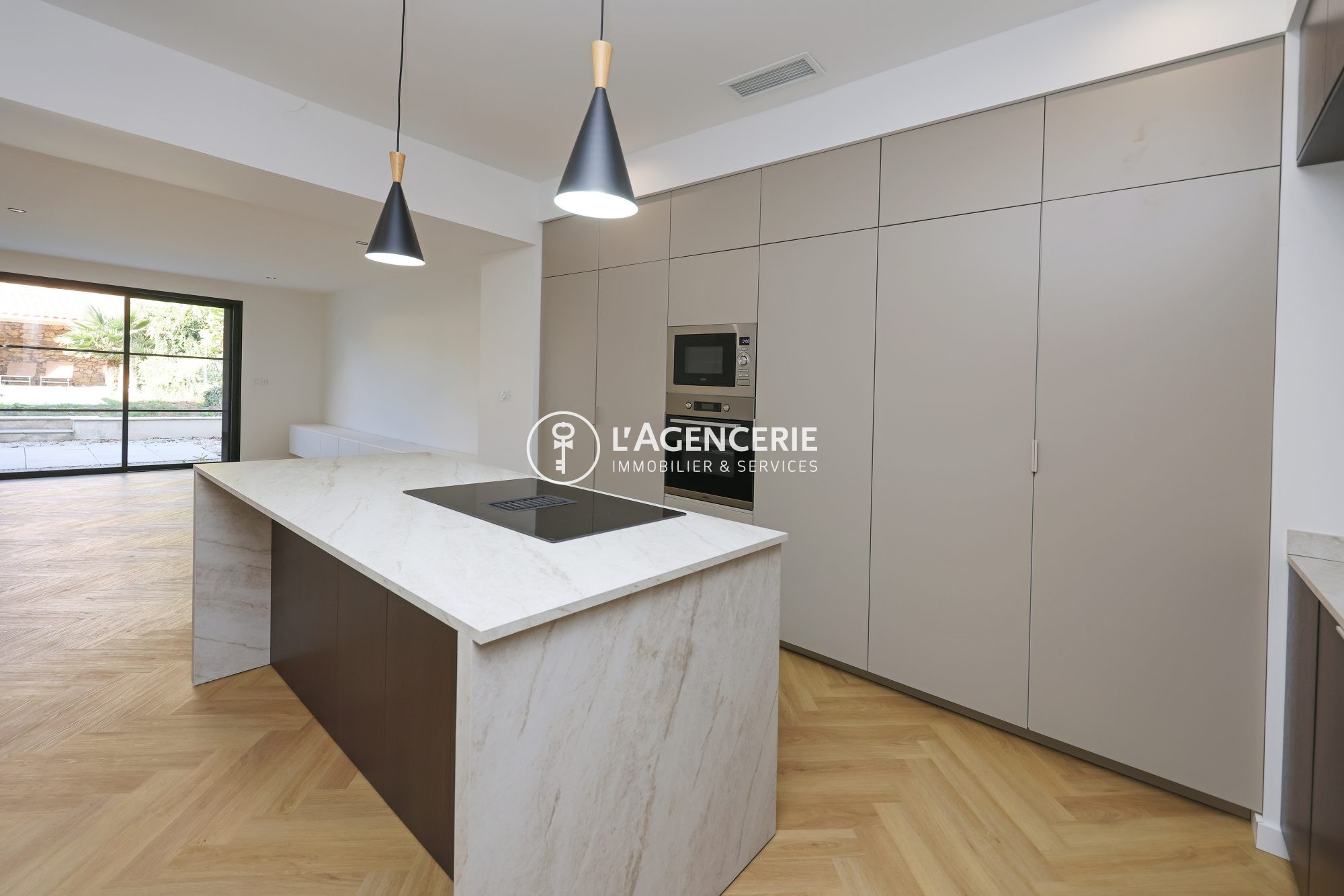 Elle se compose d'une grande cuisine équipée de 20 m² un salon/séjour de 33 m² ouvrant sur la terrasse par deux grandes baies en alu.