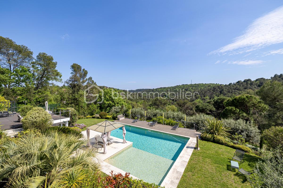Propriété d'exception avec vue panoramique ? Entre mer et collines Dominant les collines de la campagne grassoise, cette propriété remarquable bénéficie d'une vue imprenable jusqu'à la mer. Nichée au c?ur d'un parc paysager de plus de 2 hectares, elle conjugue à la perfection tranquillité, prestations haut de gamme et proximité immédiate des commodités. Le domaine s'organise autour de trois bâtis distincts : une bastide de maître, une maison d'amis et une maison de gardien. L'ensemble est complété par une superbe piscine avec cuisine d'été complète et un court de tennis. Un chemin majestueux conduit à la bastide principale, une élégante demeure de caractère d'environ 280 m². Le rez-de-chaussée accueille une belle entrée, un vaste salon, une salle à manger avec cheminée, une cuisine entièrement équipée et une cave à vins. À l'étage, la suite parentale dispose d'une grande salle de bains attenante, accompagnée d'une seconde chambre avec sa salle de bains privative. Le dernier niveau, sous les toits, abrite deux chambres supplémentaires, chacune avec salle de bains. La maison d'amis, d'environ 130 m², offre un espace de vie chaleureux avec salon, cheminée, cuisine et salle à manger. À l'étage, trois chambres, une salle de bains, et une grande suite sur demi-niveau avec salle de bains, assurent confort et intimité. La maison de gardien (environ 76 m²) comprend une pièce de vie avec cuisine, salon et salle à manger, des toilettes invités, ainsi que deux chambres mansardées, une lingerie, une salle de bains et un WC séparé. Parfaitement entretenu, ce domaine rare sur le marché se situe à seulement 30 minutes de l'aéroport de Nice et de Cannes, à quelques minutes des plus beaux golfs de la région, et à proximité immédiate du charmant village de Valbonne. Un bien unique sur la Côte d'Azur, alliant charme, authenticité et prestations de qualité.