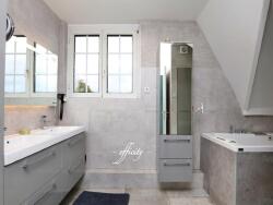 A l'étage, un palier dessert 3 belles chambres, ainsi qu'une salle d'eau avec double vasque, grande douche italienne et baignoire balnéo