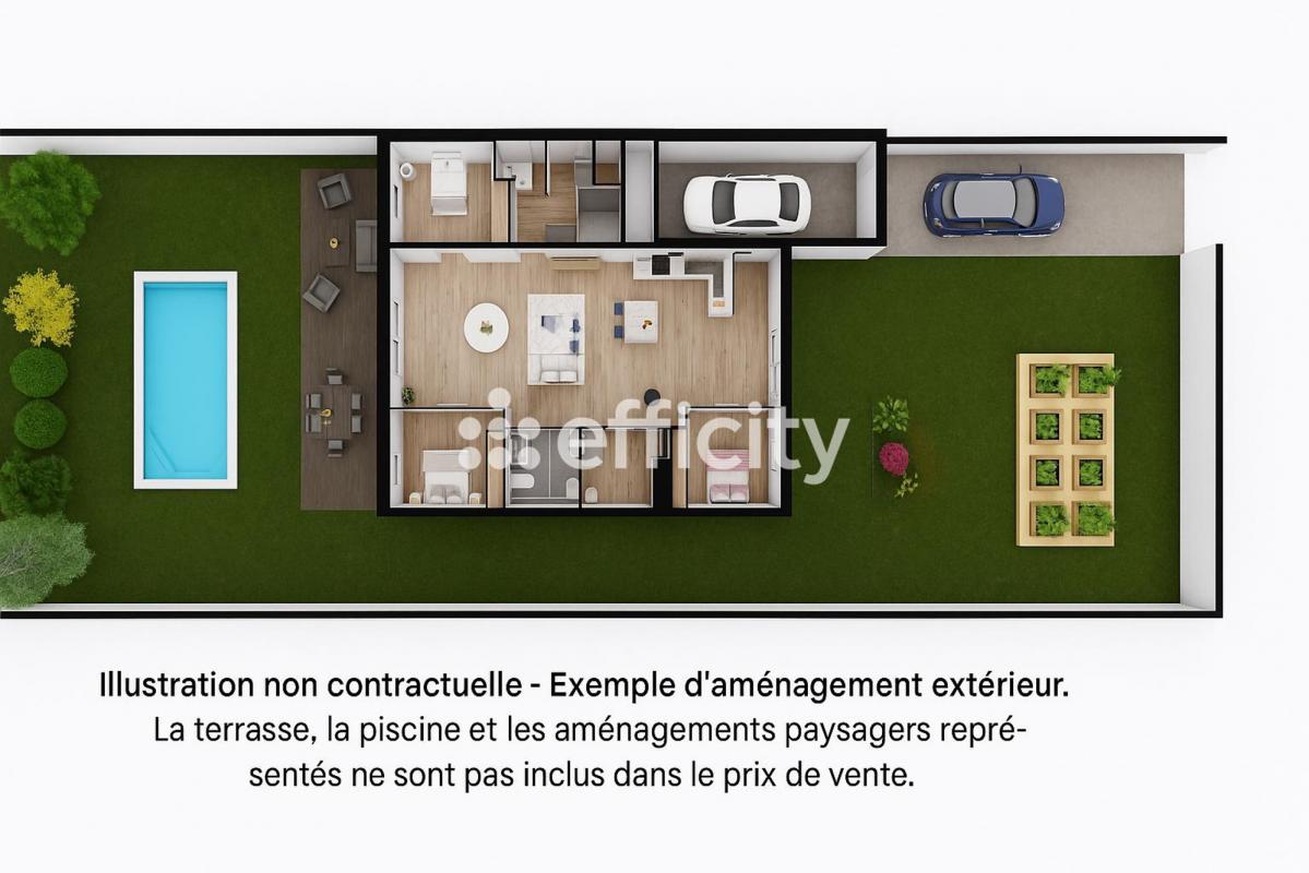 terrain clos par grillage rigide occultant, engazonné à la livraison, garage livré en l'état (non isolé, chape béton), 1 place de stationnement extérieure.