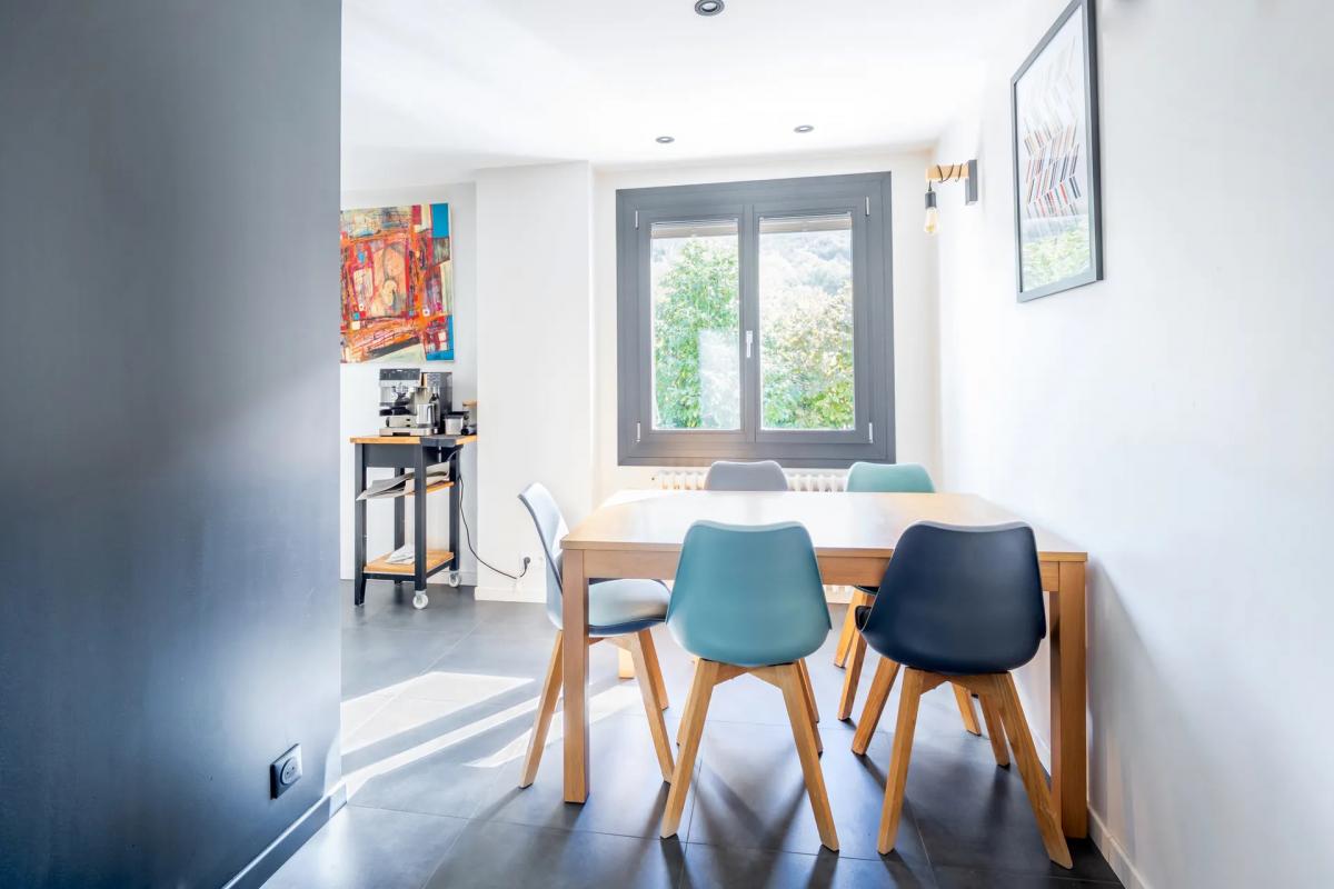 Cuisine entièrement équipée, ouverte sur une salle à manger conviviale et un séjour cathédrale baigné de lumière, sublimé par un poêle à bois, le tout offrant un accès direct au jardin
