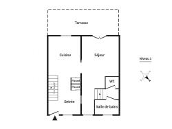 Vous y découvrirez une entrée avec placards donnant sur une cuisine spacieuse ouverte sur la pièce de vie. Une salle de bains et un WC séparé complètent le 1er niveau.