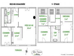 - au 1er ÉTAGE : 1 mezzanine, 2 chambres dont 1 avec dressing, 1 chambre d'enfant (moins de 9m²), 1 salle de bains avec double vasque, baignoire et grande douche à l'italienne, 1 W.C. indépendant ;