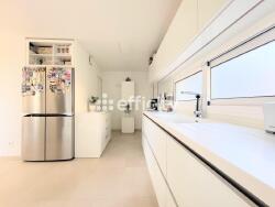 Carrelage de qualité et escalier en fer forgé de standing et design contemporain, cuisine ergonomique avec hotte, rangements et machine à café intégrée