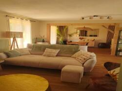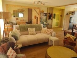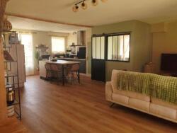 La pièce de vie traversante de 52 m², lumineuse, comprend une entrée avec WC, une cuisine neuve équipée avec un ilôt central de 2 mètres idéal pour les moments conviviaux, un salon cosy avec un poêle à granulés neuf, et une salle à manger chaleureuse. Un espace bureau en verrière vient compléter cet espace de vie.