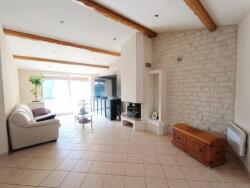 Un espace de vie chaleureux : un salon lumineux avec une grande baie vitrée et une cheminée en parfait état, pour une ambiance cosy.