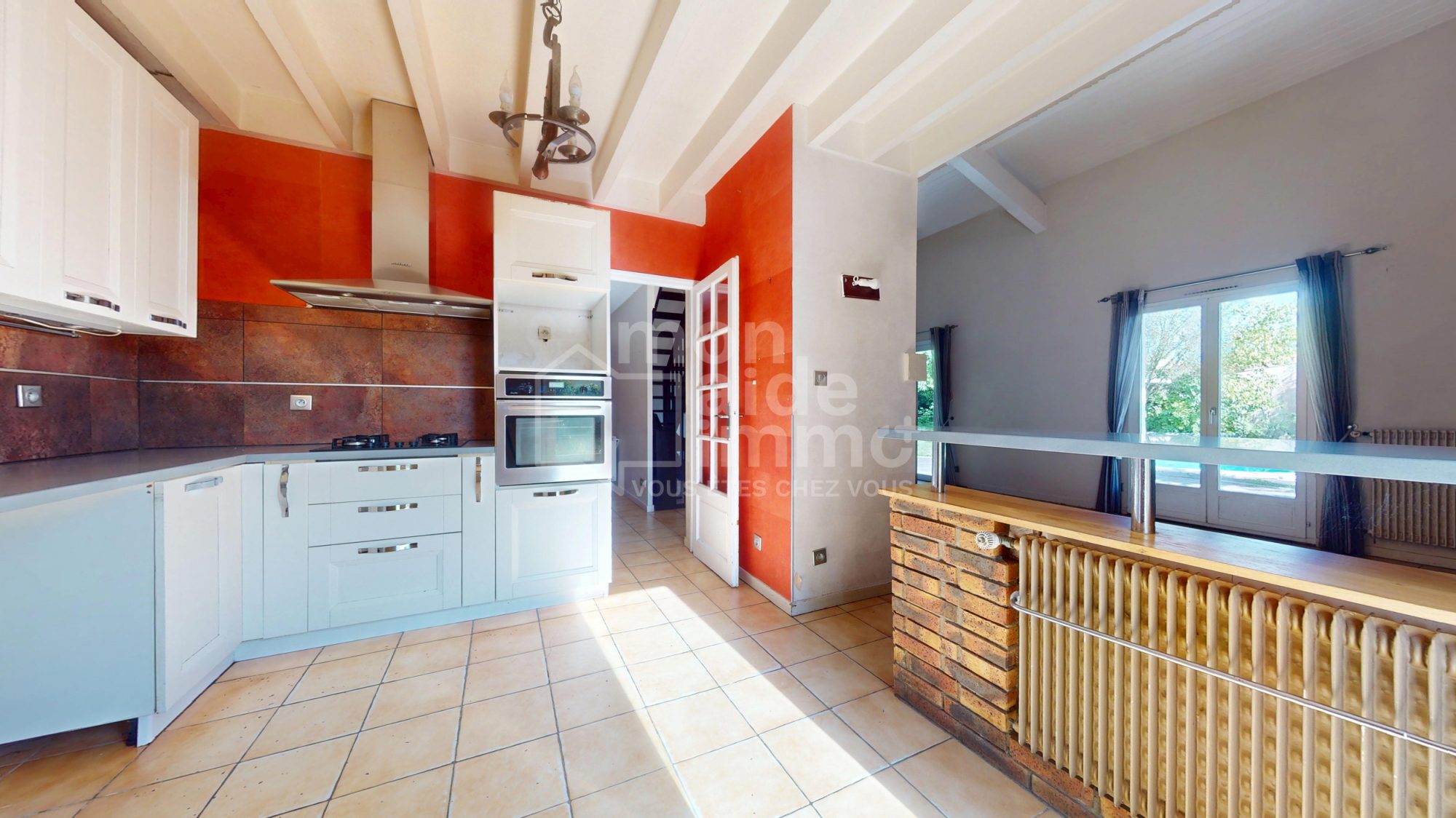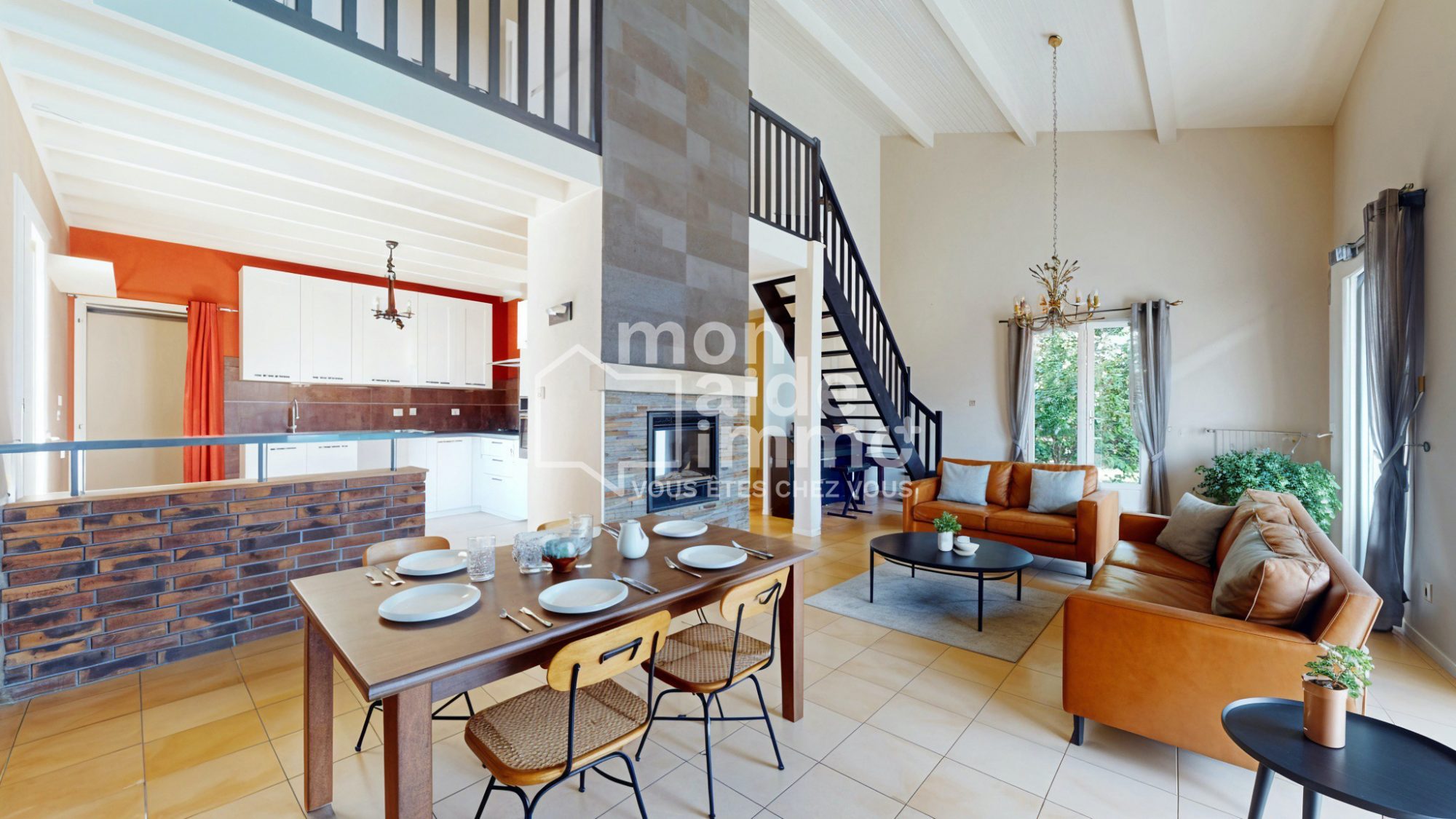 Une pièce de vie de 88 m², avec plafond cathédrale, lumineuse et ouverte, dotée de baies à galandage intègre une cuisine moderne entièrement équipée, conçue pour les gourmets, avec îlot central (cuiseur vapeur, plancha, plaque à induction, électroménager encastré), donnant directement sur la terrasse.