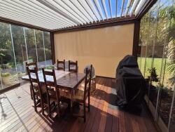 Très grand salon avec belle hauteur sous plafond et avec cheminée à insert ouvert sur une terrasse en bois exotique équipée d'une pergola bioclimatique dernière génération, offrant un espace de vie extérieur idéal pour profiter des beaux jours.