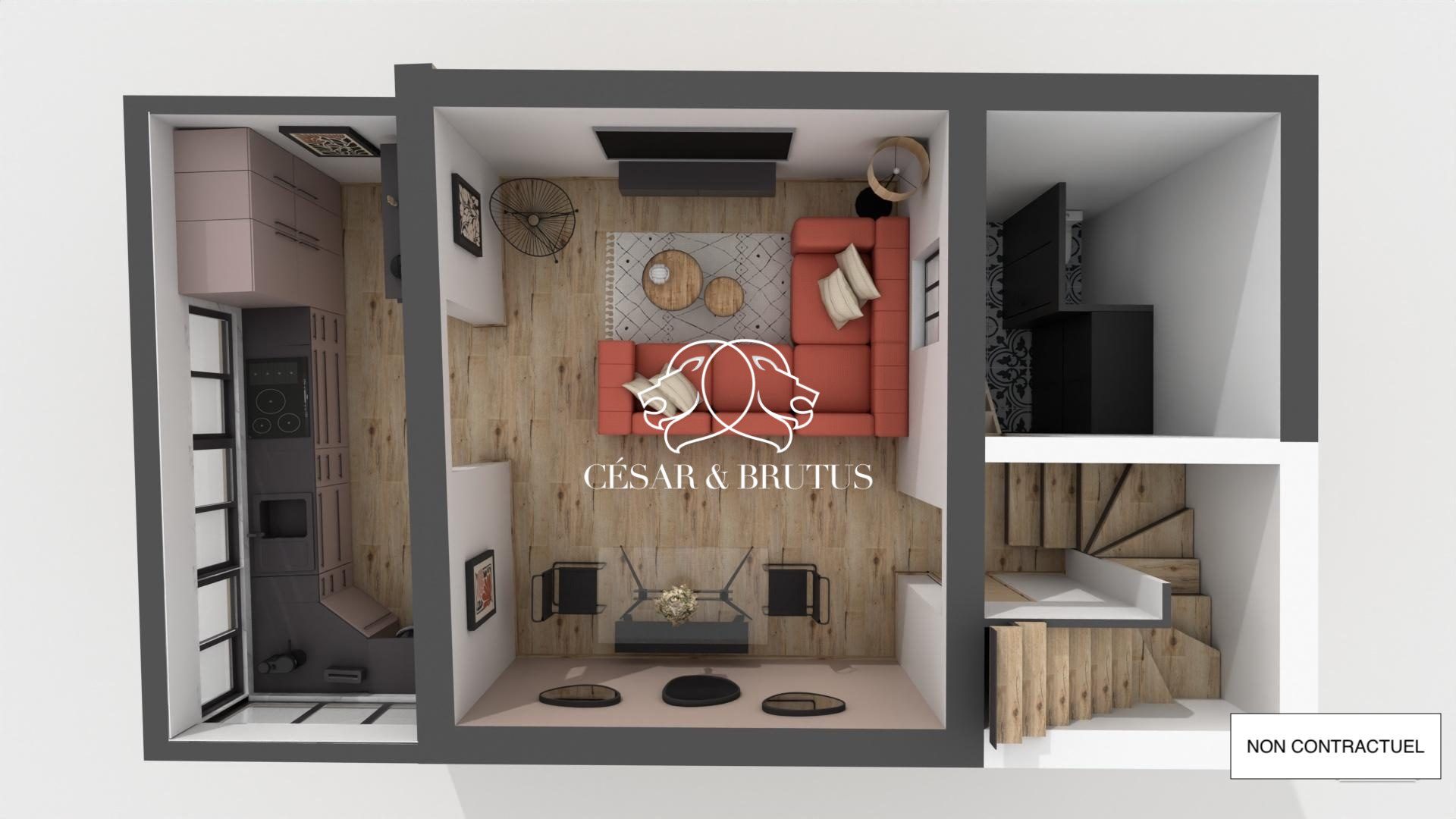 Au rez-de-chaussée : une grande pièce de vie regroupant cuisine et séjour, idéale pour partager des moments conviviaux en famille ou entre amis. Une salle de bain et un w.c. complètent ce niveau.