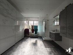 - RDC : entrée avec rangement, cuisine équipée et aménagée 17,80m², dressing, arrière cuisine, salle d'eau et grand séjour 55m², wc.