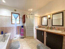 Sur les hauteurs d'un petit village conviviale du Périgord Vert, à 10 min de Mareuil, au calme, avec des vues lointaines sur les collines rurales et boisées, nichée au milieu de son grand terrain clos de plus de 8000 m2, une vaste villa contemporaine de 2008, à finir, de 192 m2 habitable. Cette villa, accessible par un portail électrique, s'offre un sous-sol aménagé sur toute la superficie de la maison dont deux garages avec volets roulants motorisés, une cave, un cellier, une buanderie, un WC et un escalier. En rez-de-jardin se trouvent une grande pièce de vie (56 m2) avec cuisine équipée, salle à manger, salon avec poêle à bois, une chambre, un bureau, une salle de bain/douche et WC. La belle terrasse, d'où des vues spectaculaires, est accessible par des grandes baies vitrées. Les 4 autres chambres (19 à 22 m2) se trouvent à l'étage avec une salle d'eau à finir (les tuyaux et les évacuations sont en place). Une de ces chambres comme le grand pallier sont en plaque de plâtre apparent, en attendant d'être mis en valeur. Toute la maison (RDC et étage) dispose d'un chauffage au sol, une pompe à chaleur (2013), une très bonne isolation des murs et sous toiture. Des huisseries en bois, double vitrage. Des panneaux solaires compensent largement la consommation d'électricité privative et de l'eau chaude. Pour ceux qui cherchent une grande maison (5 chambres, presque 200 m2 habitable, avec un grand sous-sol) dans un endroit paisible, pour la mettre à leur goût en dépensant peu de frais, mais habitable de suite, à un prix plus que correct, n'hésitez pas !!