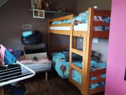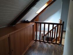au RDC surélevé : cuisine aménagée et équipée ouverte sur salle à manger-salon (poêle à bois), chambre, salle d'eau/bains, wc séparé ; à l'étage : dégagement, 3 chambres, wc ;