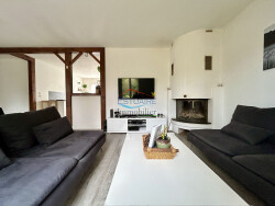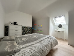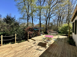 Elle comprend au rez-de-chaussée : un salon/séjour avec cheminée à foyer fermé ouvrant sur terrasse bois, une cuisine ouverte aménagée et équipée, deux chambres, une salle d'eau, un wc séparé et une buanderie. À l'étage : un palier dessert 2 chambres avec chacune un espace dressing. Le tout sur un terrain clos de 600 m2 environ avec abri de jardin pour le stockage.