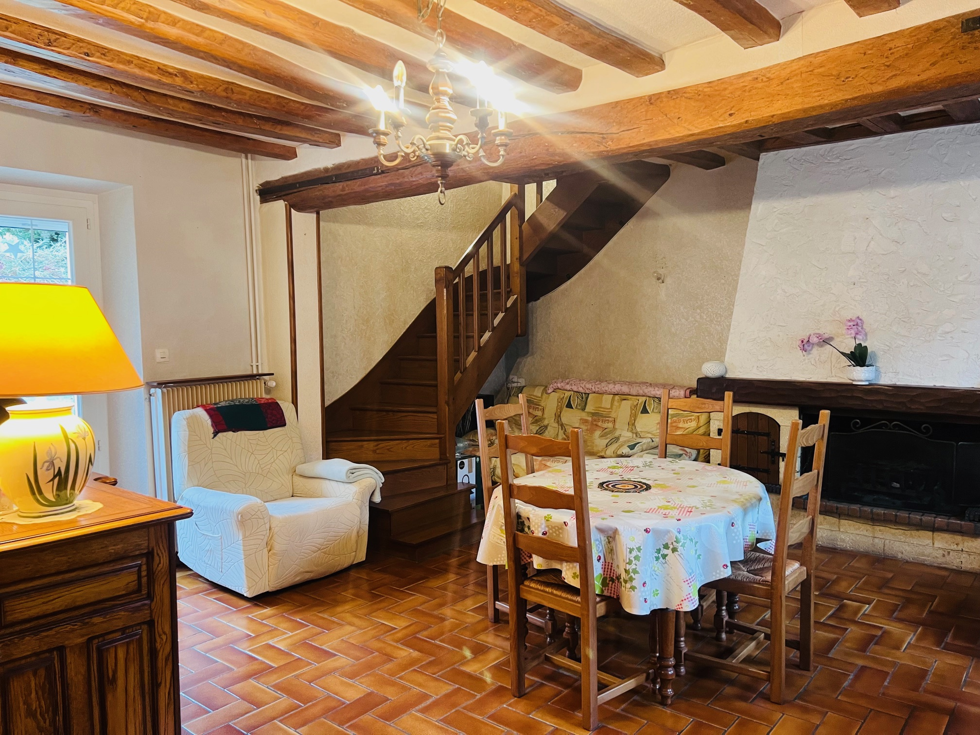 Elle propose au rez-de-chaussée une cuisine aménagée et équipée ouverte sur un salon chaleureux avec poutres apparentes et poêle à granulés, une salle à manger récente, une salle d'eau fonctionnelle et un WC indépendant