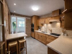 offrant : Au rez-de-chaussée : Un hall d'entrée, wc. Un salon-séjour spacieux et lumineux de 29 m2 avec baie vitrée donnant sur une terrasse. Une véranda de 22 m2 avec poêle à granulés, donnant sur la terrasse et le jardin. Dans le prolongement du salon, une cuisine, en accord avec le style de la maison,