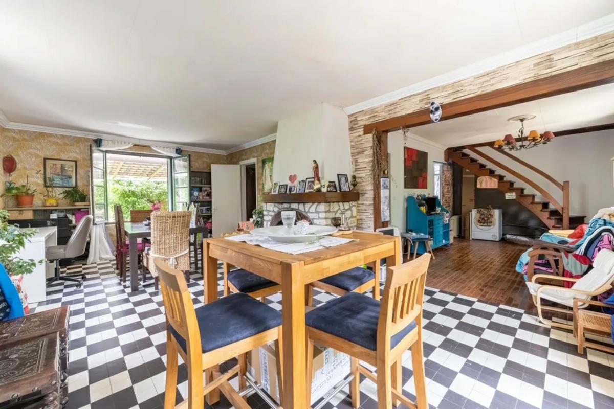 Grand séjour salon lumineux avec cheminée à foyer fermé.