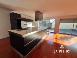La pièce de vie de 60m², ouverte sur la terrasse et le jardin plein sud, regroupe la cuisine et le séjour avec son insert bois pour les soirées d'hiver.