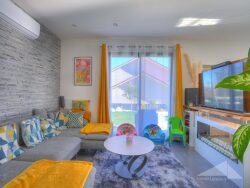 En rez-de-jardin, une belle pièce de vie comprenant cuisine équipée avec îlot central, salle à manger accédant à la terrasse, espace salon TV avec cheminée à l'éthanol, cellier / buanderie, suite parentale avec dressing et salle de douche, et un WC séparé.