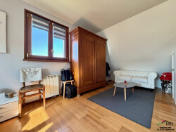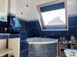 À l'étage : Un dégagement menant à 2 chambres, un espace bureau avec accès aux combles aménagés, ainsi qu'une salle de bains avec WC.