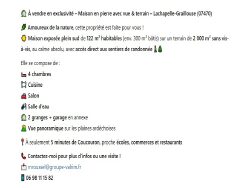 Située sur la commune de Lachapelle-Graillouse, à seulement quelques minutes des commerces, écoles et restaurants de Coucouron, cette propriété offre 122 m² habitables (environ 300 m² bâtis), sur un terrain de 2 000 m² sans aucun voisin ni vis-à-vis.