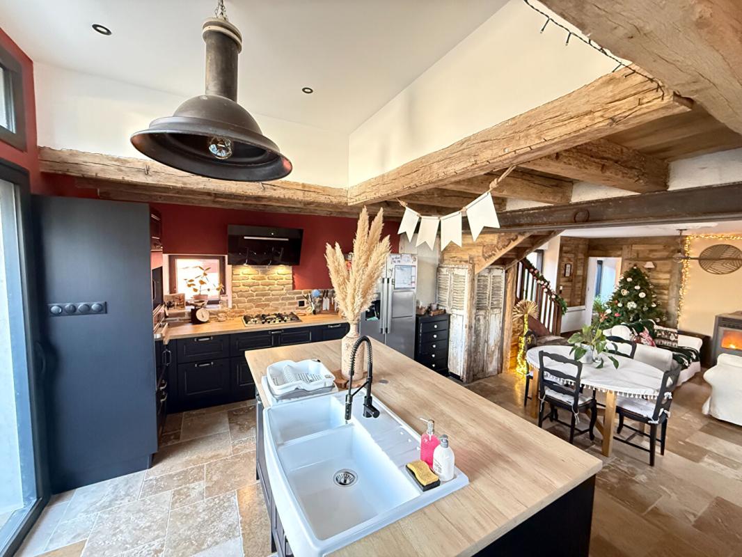 Son entrée donne sur une pièce de vie composée d'un vaste salon avec cheminée et d'un séjour. La cuisine, indépendante et aménagée, dispose d'une arrière cuisine. Une salle d'eau vient compléter le rez-de-chaussée.