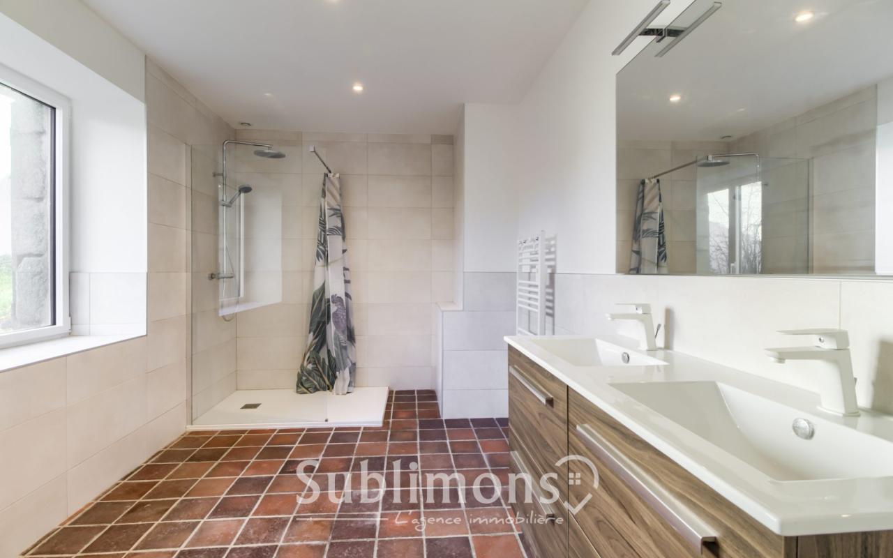 A l'étage, se trouvent également 3 grandes chambres avec de beaux volumes sous plafond, une grande salle de bain avec double vasque, une buanderie , un wc et un bureau.