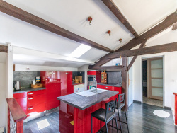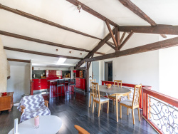 À l'étage, vous apprécierez la vaste pièce de vie de 29 m2 avec un beau plafond cathédrale et des poutres et pierres apparentes. Elle comprend la cuisine ouverte, la salle à manger et un salon cosy avec un poêle à bois. Elle vous donnera une impression de volume et d'espace particulièrement agréable !