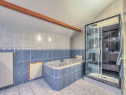 Au premier étage : deux très grandes chambres avec placards dont une avec salle de douche et WC, une troisième chambre avec placards, un bureau avec espace de stockage, un WC, un débarras, et une salle de bains avec douche.