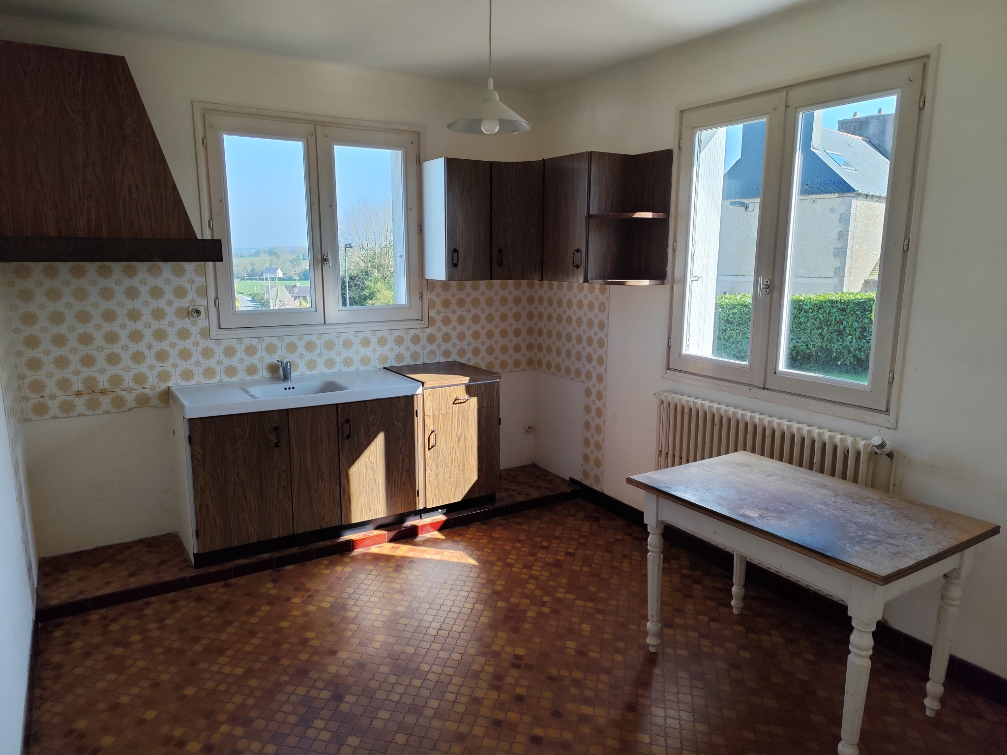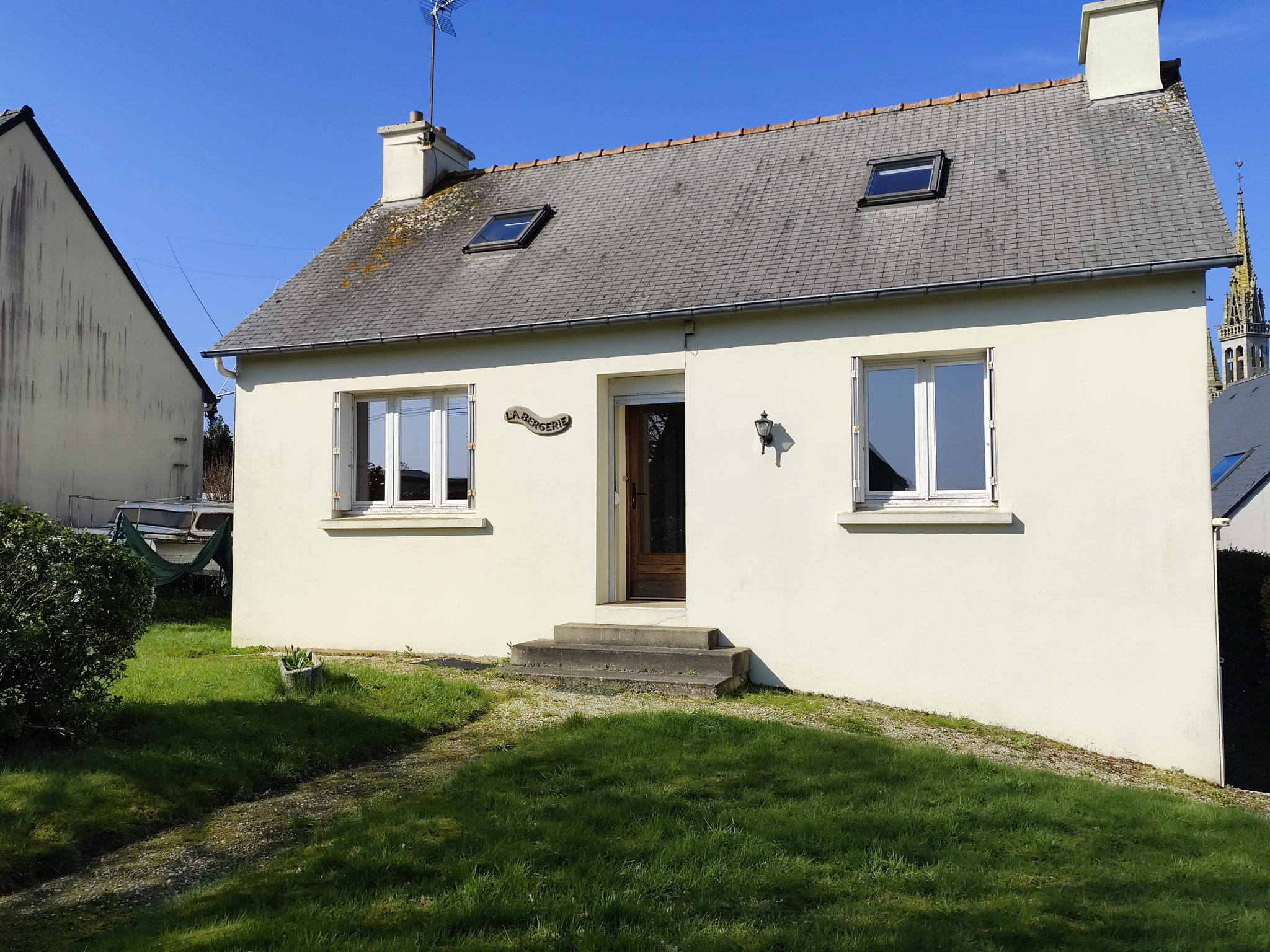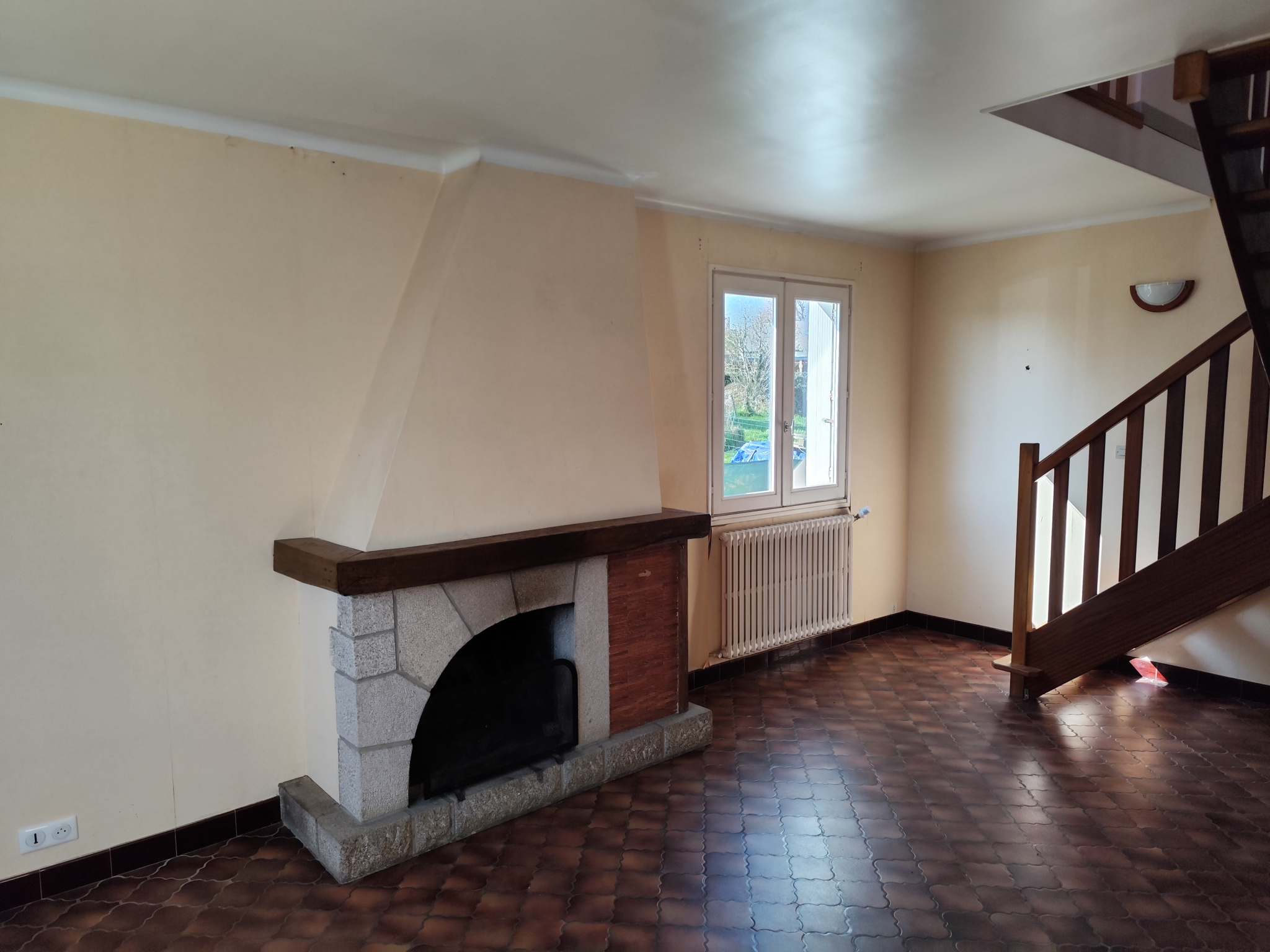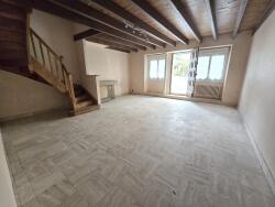 SAINT CARADEC -22600. Parfaitement située en centre bourg, accès commerces et écoles à pied. Maison mitoyenne d'un côté composée au RDC d'une grande pièce à vivre de plus de 30 m² avec cheminée, cuisine nue, une chambre. Garage fermé attenant avec chaufferie. Sur l'arrière, petite véranda extérieure donnant accès à un petit jardin. A l'étage, deux grandes chambres, un bureau, une salle de bains avec w-c. Grande terrasse plein sud idéale pour profiter du soleil. Greniers, accès par une trappe. Chauffage fuel. Beaux volumes d'ensemble.
