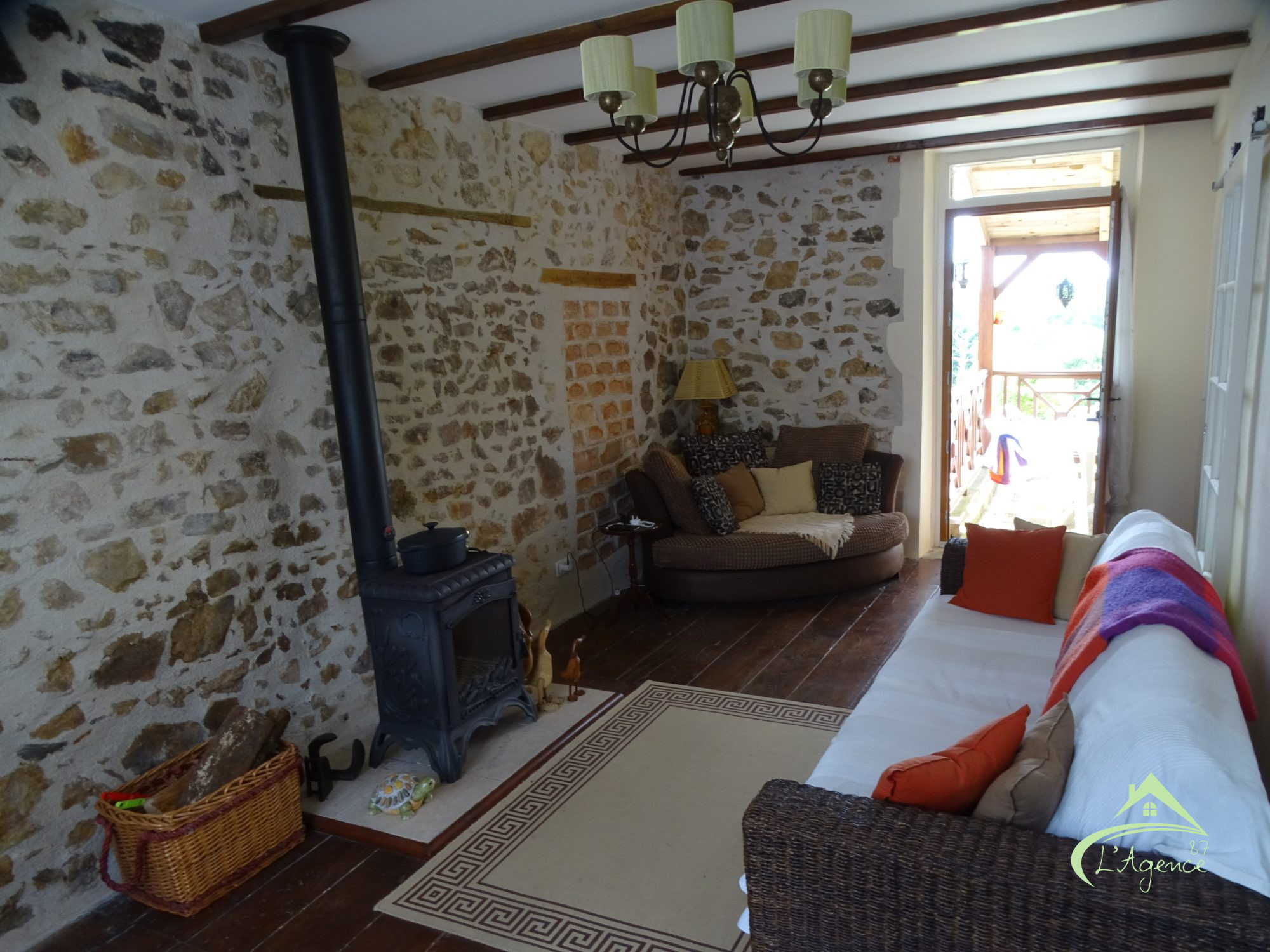 - un salon avec poêle à bois (insert), accès sur une terrasse couverte et le jardin