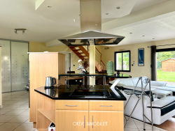 Dès l'entrée, vous serez séduit par la luminosité et les volumes généreux de la pièce de vie. La cuisine ouverte, entièrement aménagée et équipée, communique harmonieusement avec le salon chaleureux, agrémenté d'un poêle à bois qui promet de belles soirées conviviales. Le rez-de-chaussée offre également une suite parentale avec dressing et salle de bains, un WC indépendant ainsi qu'un double garage doté d'un grenier aménageable.