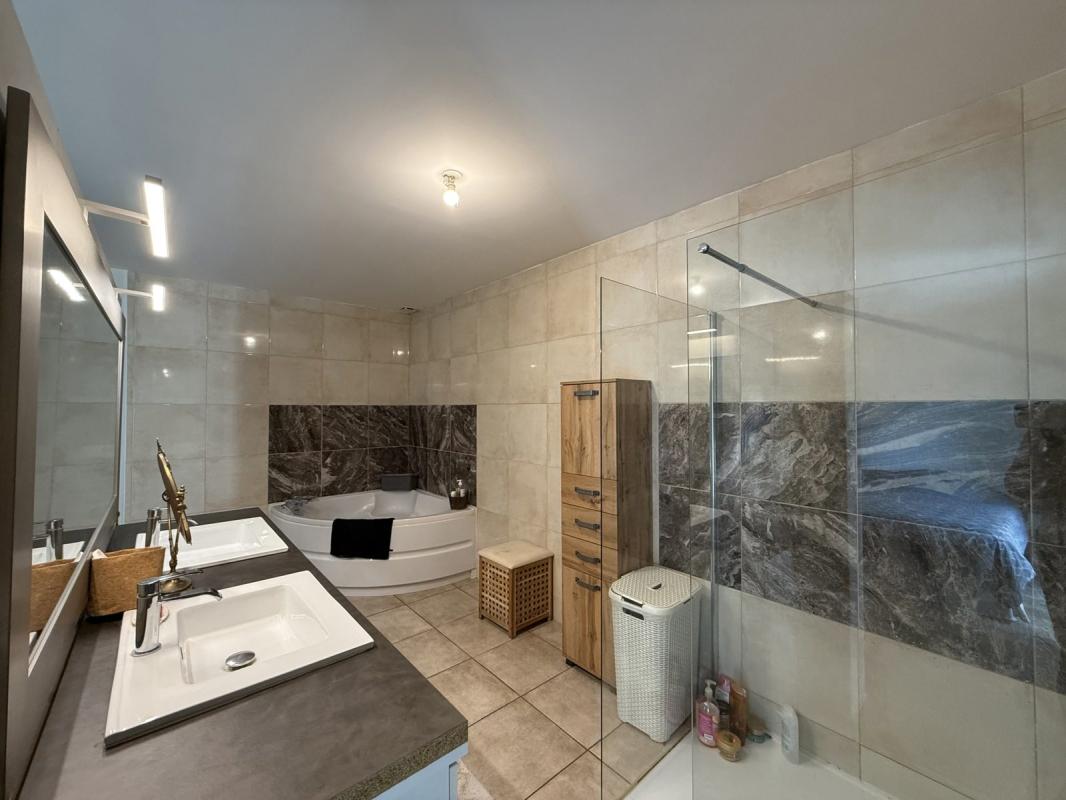 La maison se compose d'un spacieux salon (30m2) avec insert et portes fenêtres ouvrant sur la terrasse côté sud. La cuisine ouverte (10m2) est entièrement équipée et est agréablement connectée avec le séjour/salle à manger ainsi que le salon. La salle à manger donne également sur la terrasse extérieure. Finalement il y a un coin bureau (14m2) avec accès sur le jardin. Le côté nuit de la maison est composé de 3 chambres (19m2, 11m2 et 11m2) dont la plus grande avec spacieux dressing. La salle d'eau comprend une douche à l'italienne et il y a des toilettes séparées. Il y a une entrée arrière servant comme buanderie/cuisine arrière et cellier (11.5m2).