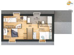 Cette maison de 4 chambres offre une superficie utile de 107 m², avec une distribution idéale à une vie de famille. Elle propose une suite parentale avec sa salle d'eau attenante au rez-de-chaussée, parfait pour séparer le coin nuit de celui des enfants, des espaces dressings dans chaque chambre et une cuisine fonctionnelle. Ce plan a été pensé pour faciliter l'accès à la propriété avec un budget maîtrisé.