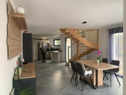 L'entrée donne sur une grande pièce de vie composée d'un salon, d'une salle à manger et d'une cuisine ouverte. Le rez-de-chaussée dispose également d'une suite parentale avec douche et dressing, d'un wc et d'un garage.