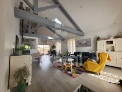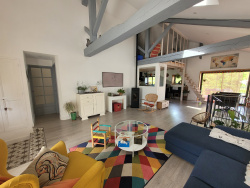 La belle et grande pièce de vie, traversante et baignée de lumière, s'organise autour d'un poêle à granulés, créant une atmosphère conviviale.