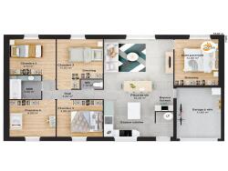 Cette maison de 5 chambres ou 4 chambres + bureau offre une distribution idéale à une vie de famille en respectant un cout de construction optimisé. Elle est pleine d'atouts grâce à sa belle pièce de vie traversante et lumineuse, sa chambre parentale dissociée des autres pièces de nuit et son garage à vélos intégré pour des m² de rangements supplémentaires à un cout minimisé. Son plus : elle est ajustable à vos besoins avec ses options salle d'eau parentale et/ou WC supplémentaire. Ce plan a été pensé pour faciliter l'accès à la propriété avec un budget maîtrisé.