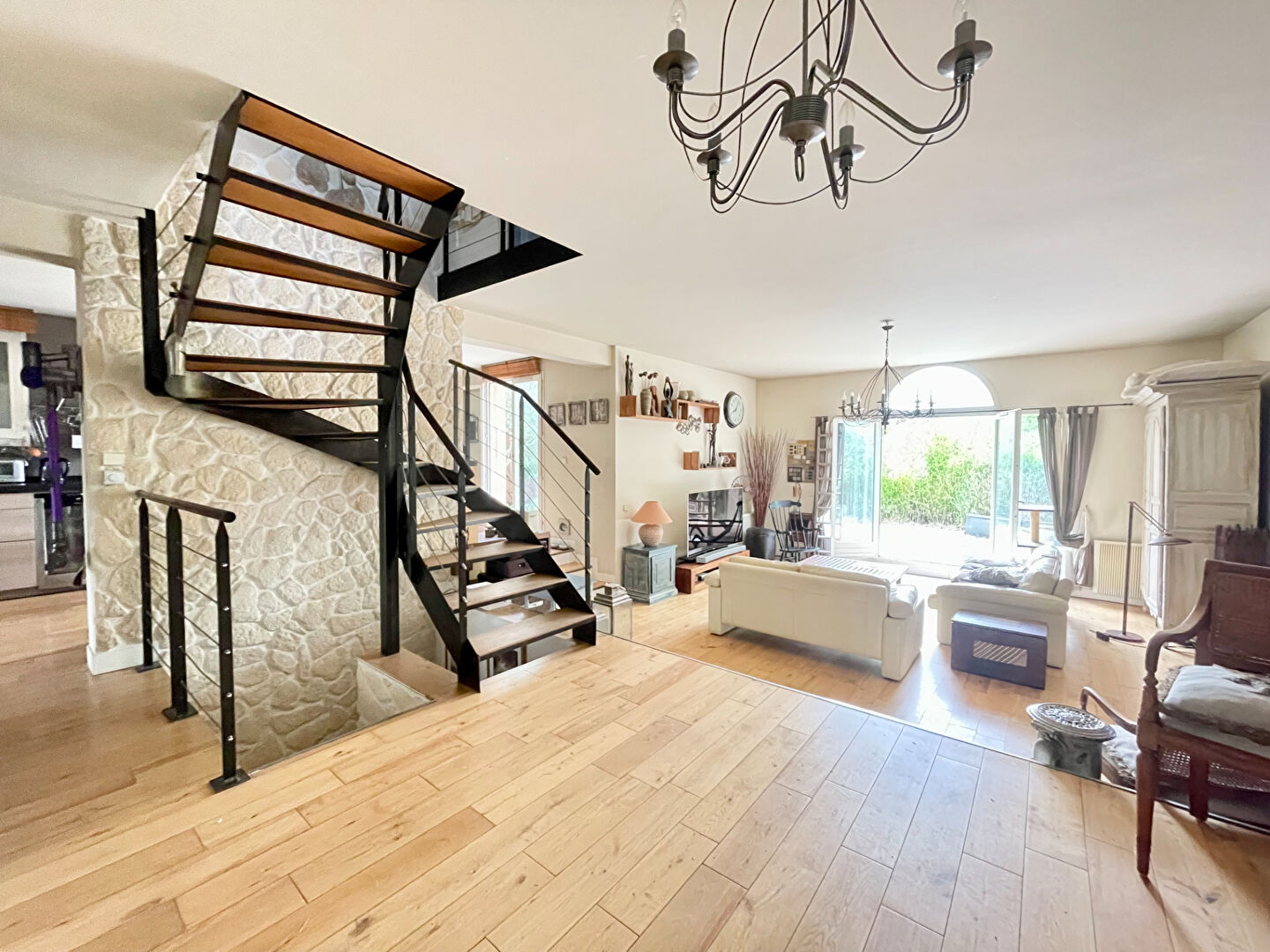 Elle se compose, d'une entrée, d'un double séjour avec baies vitrées et accès direct sur la terrasse et le jardin, d'une cuisine séparée, de deux chambres, d'une salle d'eau, wc séparés A l'étage, un second double séjour avec une cheminée d'origine, une cuisine séparée, deux chambres, une salle de bain, wc séparés ainsi qu'un petit escalier menant au grenier de 45 m2. Possibilité de construire une piscine. Buanderie/Cave à vin/Poulailler/Garage