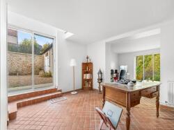 Les matériaux d'époque (poutres, parquet, tomettes) et son exposition lui confèrent une atmosphère chaleureuse et lumineuse. Au rez-de-chaussée : une entrée carrelée, une cuisine séparée, un vaste triple séjour/salle à manger traversant, un grand bureau en rez de jardin pouvant être transformé en suite parentale, et dans une aile de la maison un magnifique espace modulable selon vos envies (salon d'été, atelier, bureau, espace pour les invités?). À l'étage : trois grandes chambres avec rangements, une salle de bain, une salle d'eau et un WC séparé.