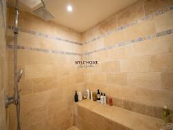 Une superbe terrasse en travertin de 120 m², dont 30 m² couverts par un toit en tuiles et charpente