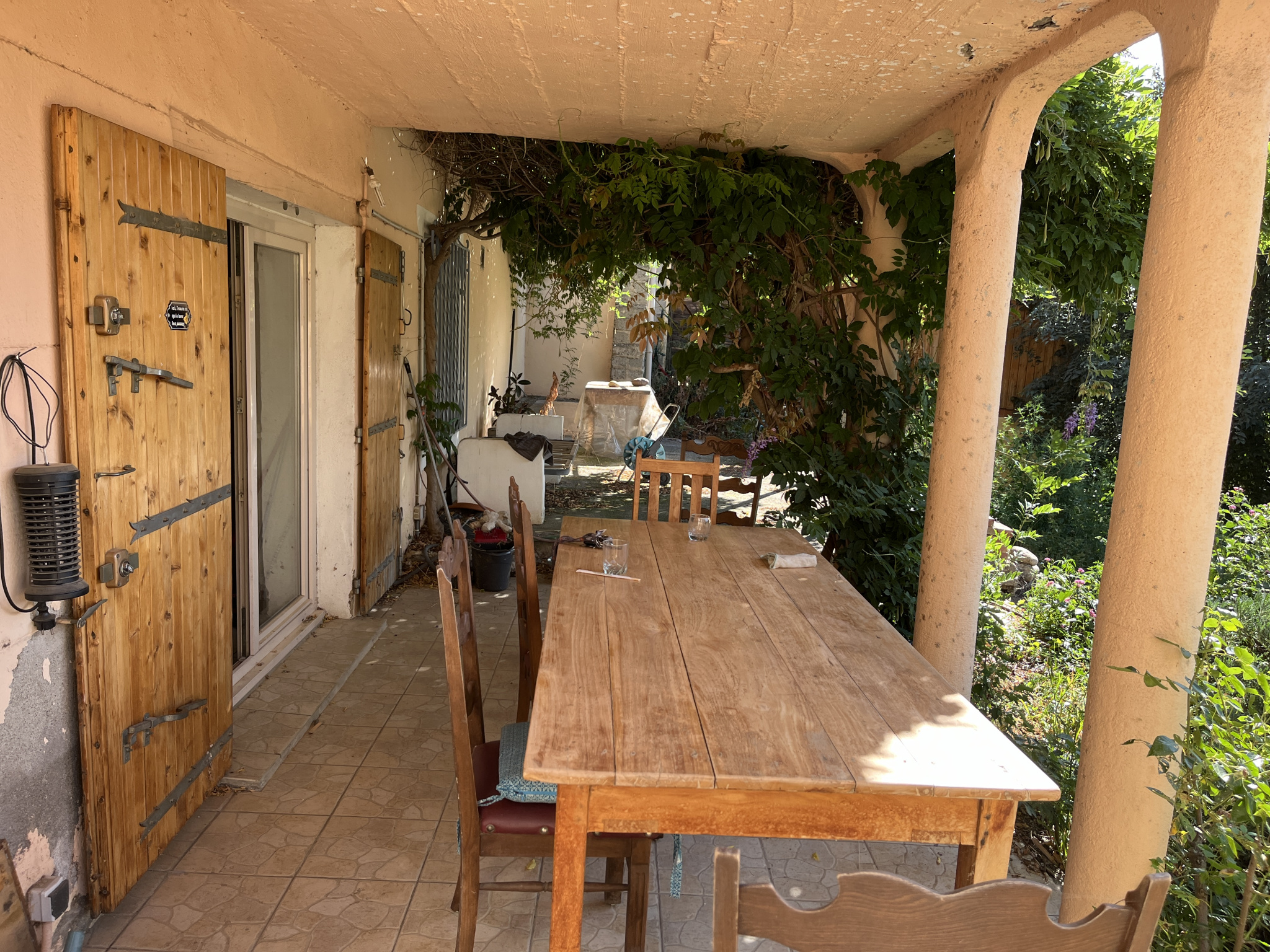 Ces pièces de vie se prolongent naturellement vers une terrasse où le regard se perd Une vue panoramique, sans aucun vis-à-vis, seulement la nature, les champs d'olivier et de vignes et les Albères pour horizon. Une invitation permanente à s'asseoir, respirer, et profiter d'un décor vivant et serein.