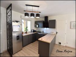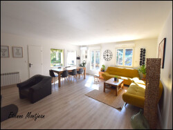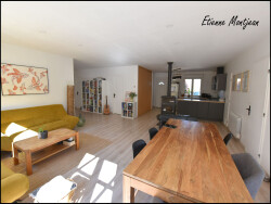 Dès l'entrée, la maison séduit par sa grande pièce de vie, spacieuse et très lumineuse, véritable coeur de la maison. Les volumes sont généreux, l'atmosphère est chaleureuse, et le confort est au rendez-vous en toute saison grâce à la climatisation réversible et au poêle.
