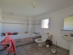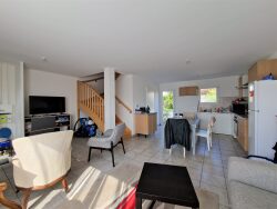 Une maison à étage de 77,25m² de 2018 comprenant au rez-de-chaussée : un séjour-salon avec placard d'entrée et une cuisine aménagée et équipée (four, plaques de cuisson, hotte) et une salle d'eau avec WC.